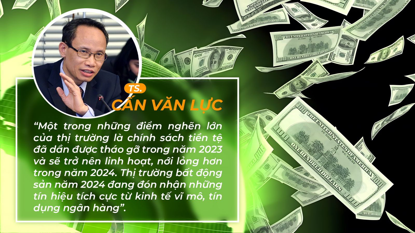 TS. Cấn Văn Lực, Chuyên gia Kinh tế trưởng BIDV, Thành viên Hội đồng Tư vấn Chính sách Tài chính - tiền tệ Quốc gia nhận định, một trong những điểm nghẽn lớn của thị trường là chính sách tiền tệ đã dần được tháo gỡ trong năm 2023 và sẽ trở nên linh hoạt, nới lỏng hơn trong năm 2024. Thị trường bất động sản năm 2024 đang đón nhận những tín hiệu tích cực từ kinh tế vĩ mô, tín dụng ngân hàng.