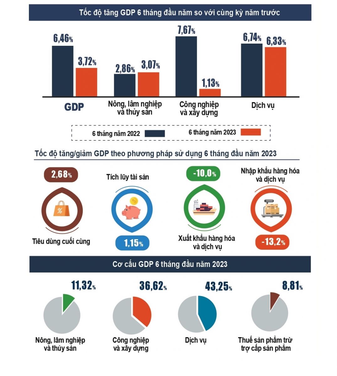 Trong đó, GDP quý I tăng 3,32% và quý II tăng 4,14%. Mức tăng trưởng kinh tế quý II thấp hơn rất nhiều so với kịch bản mà Bộ Kế hoạch và đầu tư đưa ra vào đầu tháng 4/2023.